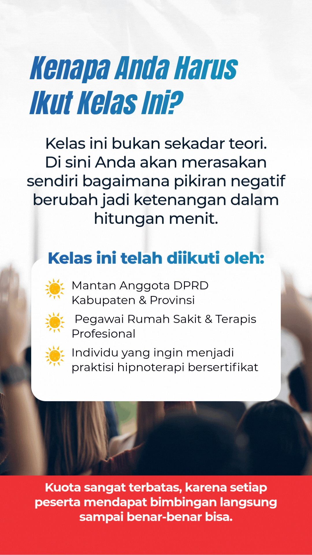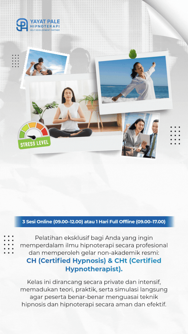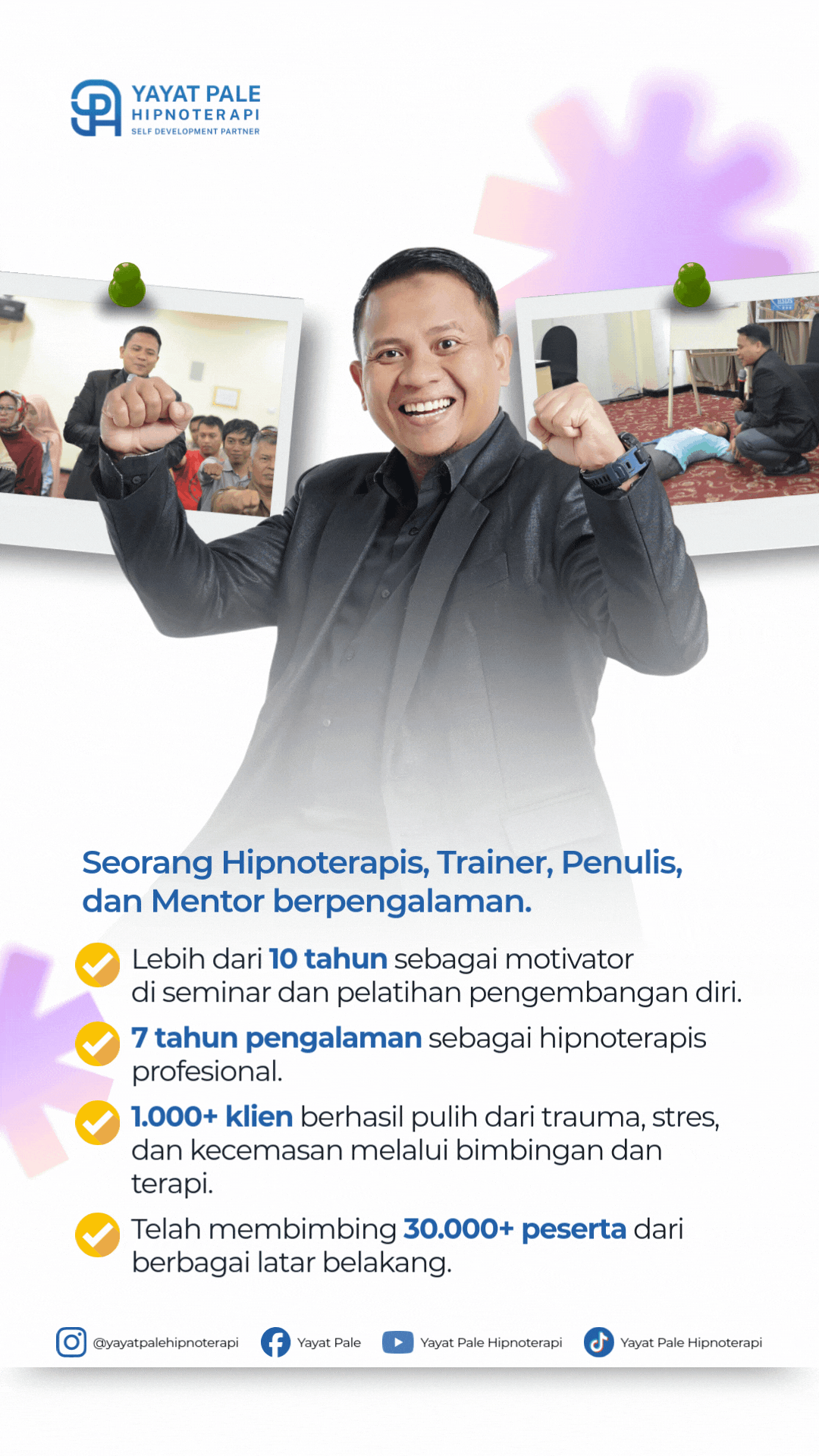 Coach Yayat Pale dilahirkan di Palembang, Dari keluarga sederhana yang tidak Menghentikan semangat untuk terus belajar Hingga Sampai dengan saat ini Pendidikan terakhir yaitu Magister Hukum. Pendidikan Non Formal yang ditempuh Dengan Gelar Ch, Cht, CI., CNNLP, C.Esther, CT, Membuat Rasa cinta terhadap dunia Pelatihan, Sejak 10 tahun lalu Beliau memberikan training Motivasi kepada Pelajar Lalu Memfokus terjun ke dunia Hipnoterapi Alhamdulillah jangkauan untuk memberikan Berbagi Manfaat lebih luas untuk masyarakat umum saat ini pengalaman sebagai Hipnoterapis 7 tahun lebih. Sudah Lebih 1.000 Orang yang sudah dibantu disembuhkan melalui teknik-teknik terapi dan lebih dari 30.000 Orang yang sudah di ajarkan teknik Terapi ini baik secara kelas Online atau offline, saat ini beliau telah memiliki Klinik Terapi di Bandung. Apakah Anda Tertarik Mengundang Coach Yayat Pale di Lembaga, Instansi, Perusahaan, Komunitas, Yayasan, Personal atau Lainnya? Dalam Bentuk Inhouse Training, Public Training, Mentoring, Private Training, Coaching, Motivasi, Terapi Personal dll Hubungi 081122880800 (Admin YPH) Follow IG : @yayatpalehipnoterapi FB : Yayat Pale YT : Yayat Pale Hipnoterapi Tiktok: Yayat Pale Hipnoterapi Website: www.yayatpalehipnoterapi.com
